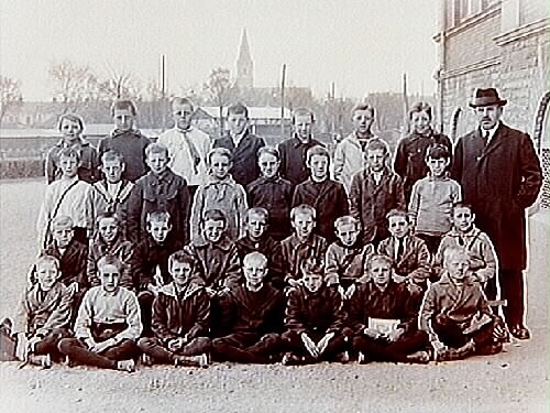 Norra Folkskolan, 31 skolpojkar med lärare, sal 18. Skolbyggnad i bakgrunden.