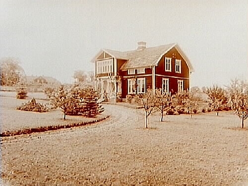 En och en halvvånings bostadshus med frontespis och veranda.
