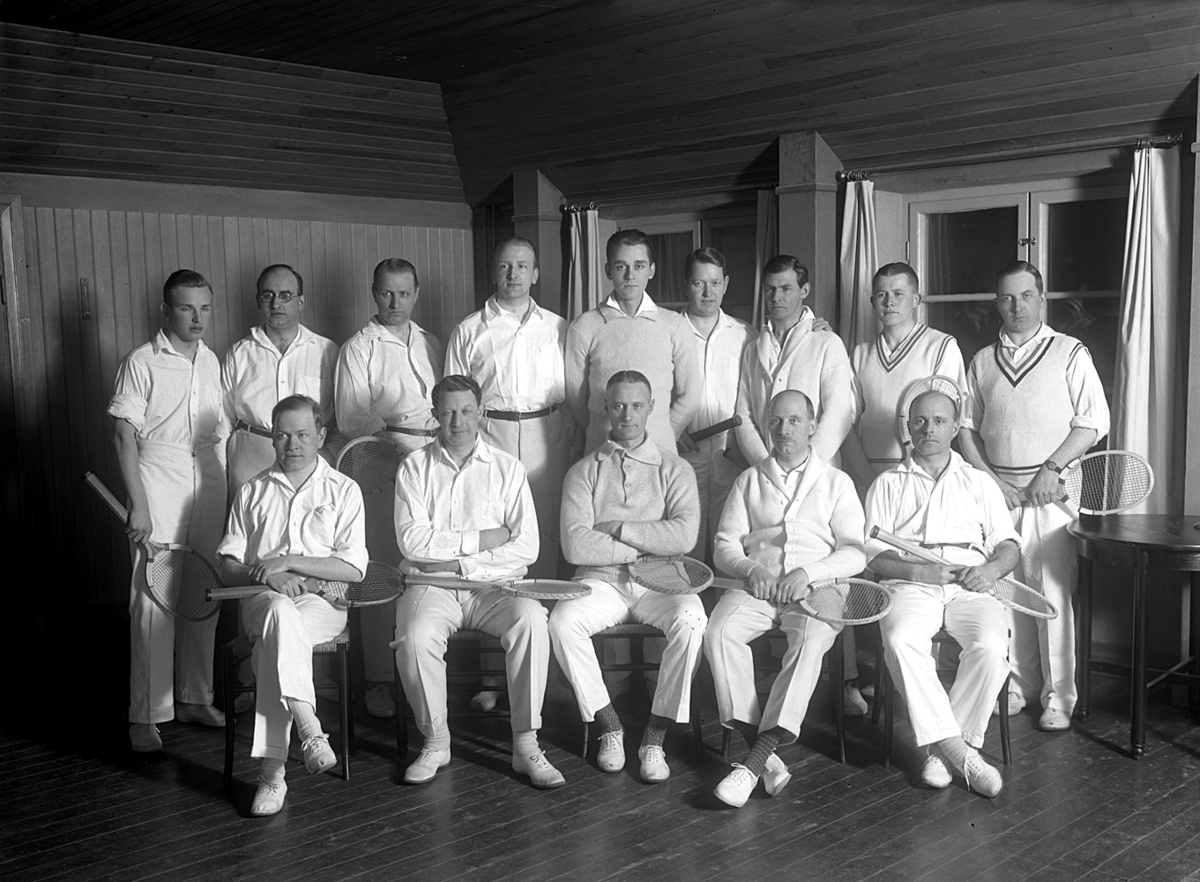 Interiör av Tennishallen, 14 manliga tennisspelare.