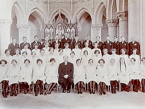 Konfirmander, 34 flickor, 13 pojkar och pastor Marklund.