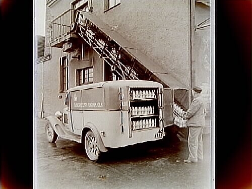 Skåpbil av märket Volvo, lastning av tuberkelfri barnmjölk i glasflaskor.