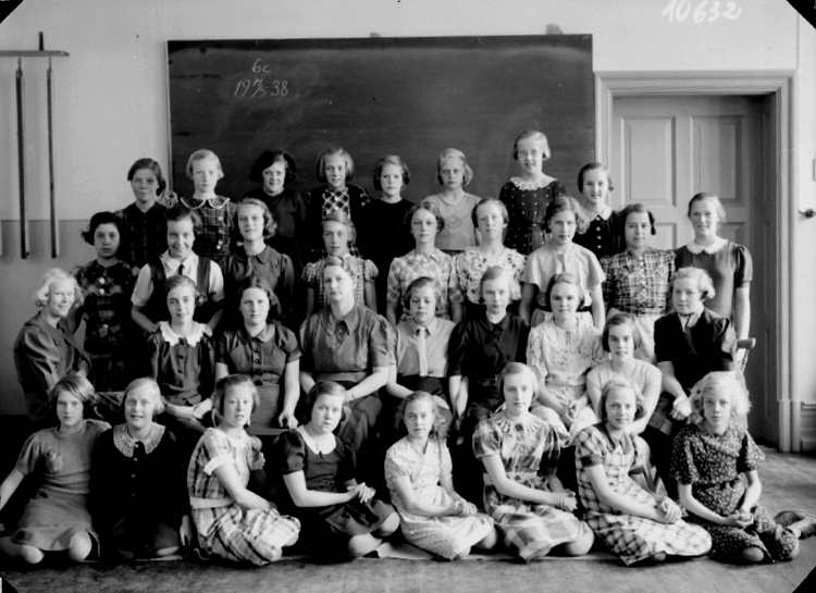 Vasaskolan, klassrumsinteriör, 32 flickor med lärarinna fröken Margit Svensson.