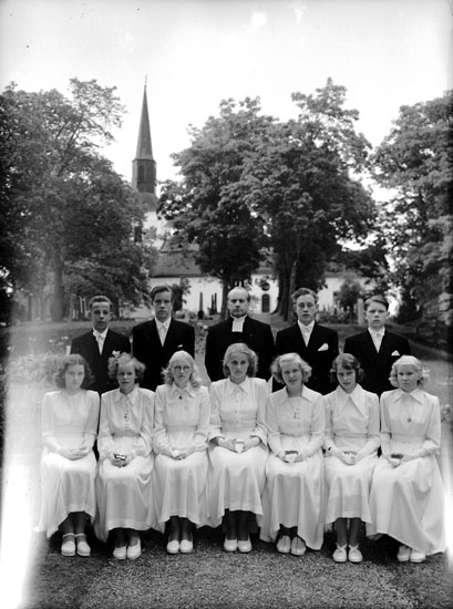 Elva privata konfirmander, sju flickor, fyra pojkar och kyrkoherde Sköldebrand.