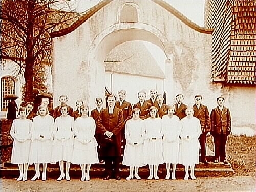 Konfirmander, 8 flickor, 12 pojkar och kyrkoherde Abrahamsson.