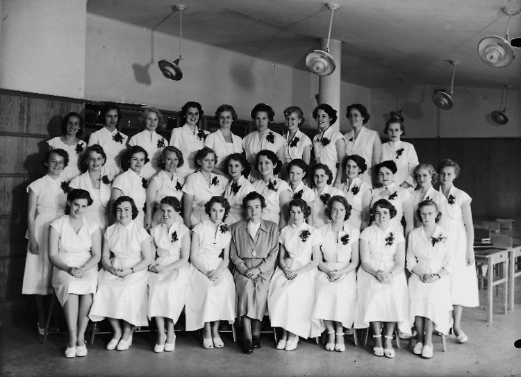 Kommunala Flickskolan, klassrumsinteriör, 31 flickor med lärarinna fröken Lilly Källqvist. Avgångsklassen.