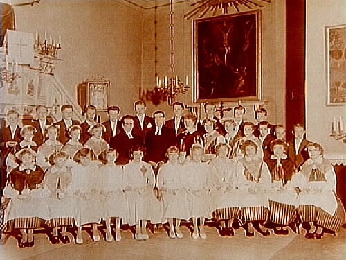 Konfirmander, 19 flickor, 13 pojkar, pastor Erik Linden och prosten Gabriel Carlsten.