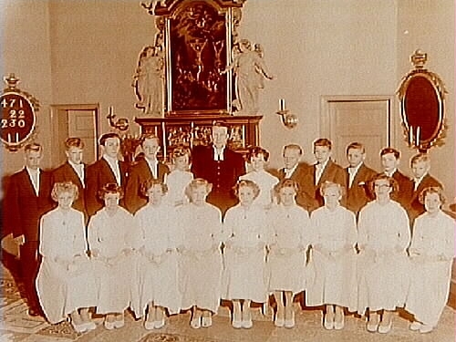 Konfirmander, 11 flickor, 9 pojkar och pastor Lövberg.