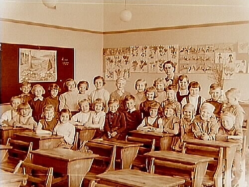Titel: Engelbrektsskolan, klassrumsinteriör, 28 skolbarn med lärarinna fru Estrid Lundh, klass 2an, sal 6.