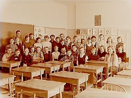 Olaus Petriskolan, klassrumsinteriör, 33 skolbarn med lärare Eric Fransson, klass 6Aa, sal 33.