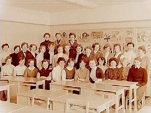 Olaus Petriskolan, klassrumsinteriör, 29 flickor med lärarinna fröken Birgit Göransson, klass 8a, lokal i Tullhuset, 3 trappor.