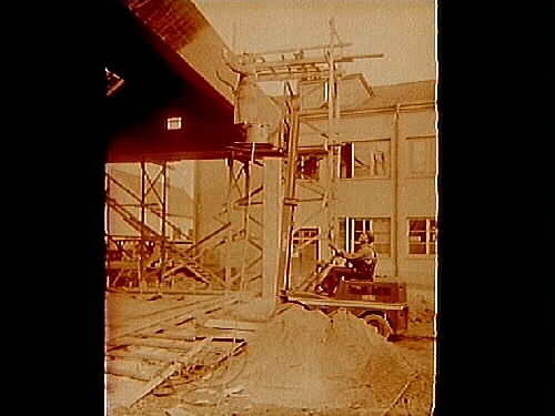Jahrls Mekaniska Verkstad, en man stående på en gaffeltruck med en tryckluftpistol.