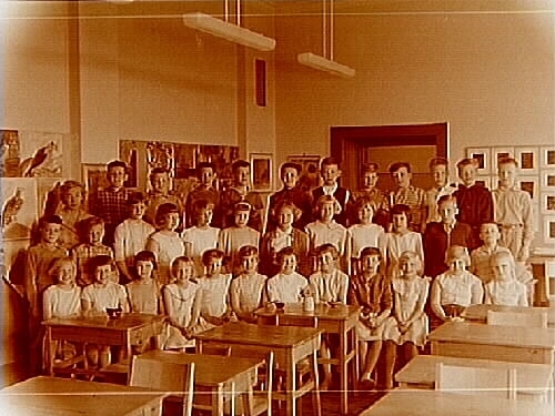 34 skolbarn och lärarinna fru Britta Sahlin.