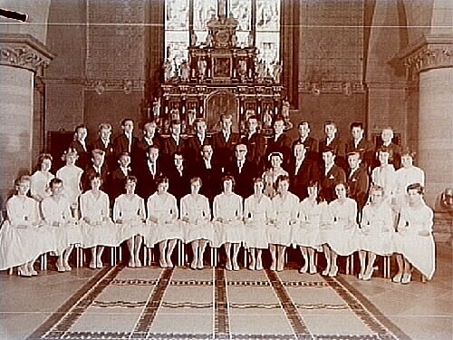 Hörselskadade konfirmander, 17 flickor, 17 pojkar och rektor H. Zommarin.