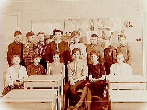 13 skolbarn och lärarinna fröken Maja Karlsson.