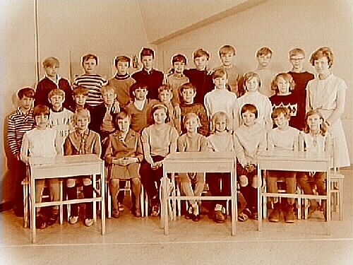 28 skolbarn och lärarinna fröken Birgit Lövgren.