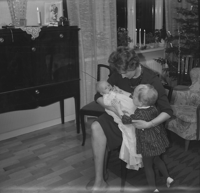 Rumsinteriör, en kvinna och två barn. Barndop.