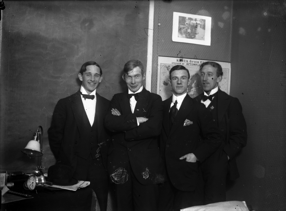 Interiör, grupp fyra unga män.