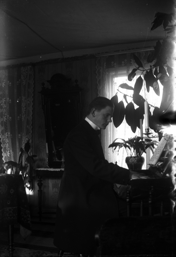 Rumsinteriör, en man vid pianot.