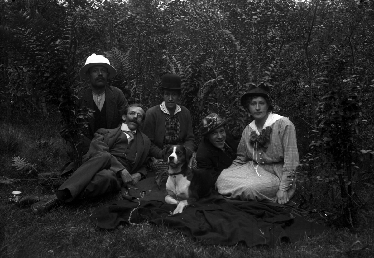Fem personer och en hund i göngräset.