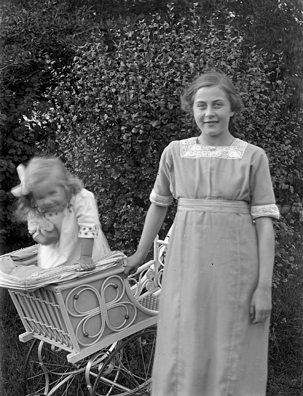 Två flickor (eller en kvinna med ett barn i barnvagnen).