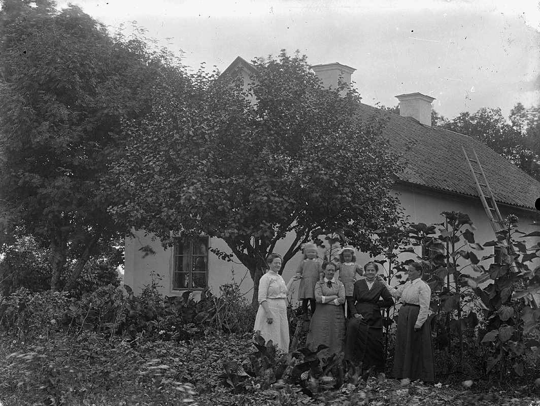 Bostadshus, fyra kvinnor och två små flickor i trädgården.