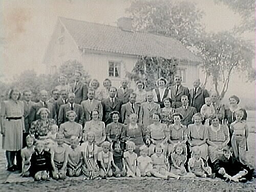 Bostadshus, släktgrupp 47 personer framför huset.