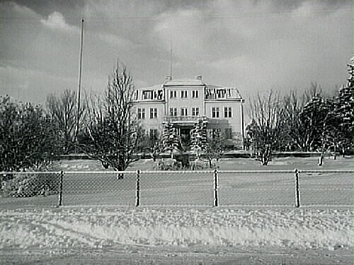 Tvåvånings villa med inredd vind, frontespis, balkong, brutet tak.
