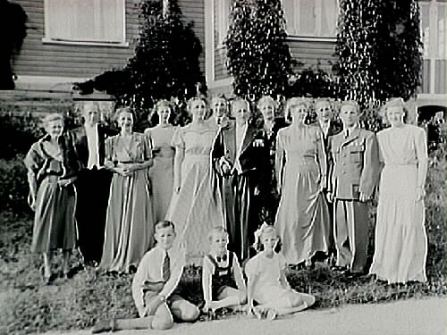 12 vuxna och 3 barn i trädgården.