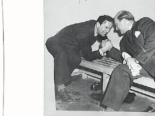 Gunnar Johansson och Sven Olov Gårdrup båda ledare i ÖSK, bryter arm.