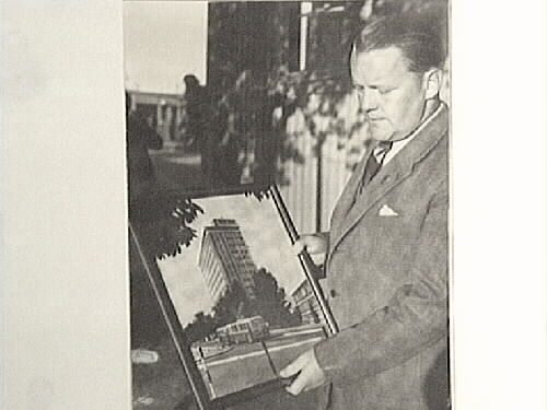 Lagledare Gösta Pettersson (ÖSK) beundrar tavlan ÖSK fått av BATA ZLIN (tjeckiskt fotbollslag), ÖSK:s gäster.