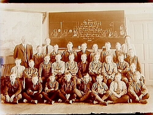 Vasaskolan, klassrumsinteriör, 28 skolpojkar med lärare F. Kuhlin, sal 11.