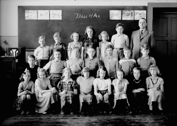 Olaus Petriskolan, klassrumsinteriör, 21 skolbarn med lärare Ture Eriksson.