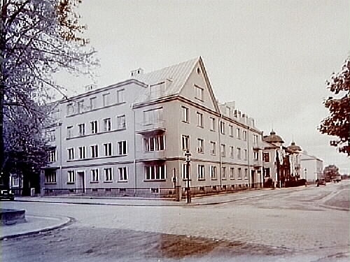 Stenhus i tre våningar med fasad i gråbrun grovputs, hörnfastighet Olaigatan - Faktorigatan.