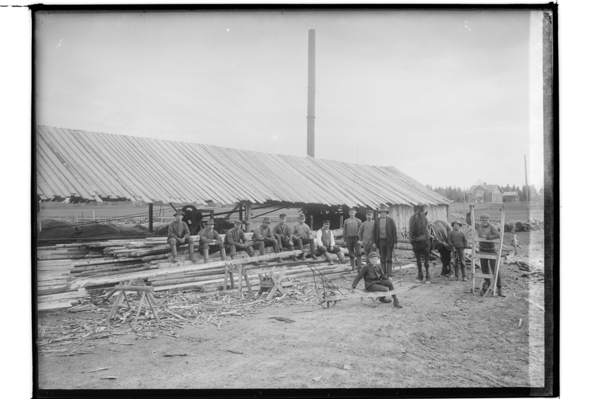 Bakom ångsågen går järnvägen Svartåbanan med Örebro till vänster och Svartå till höger. Byggnaden uppe till höger heter idag Gropen Haganäs.