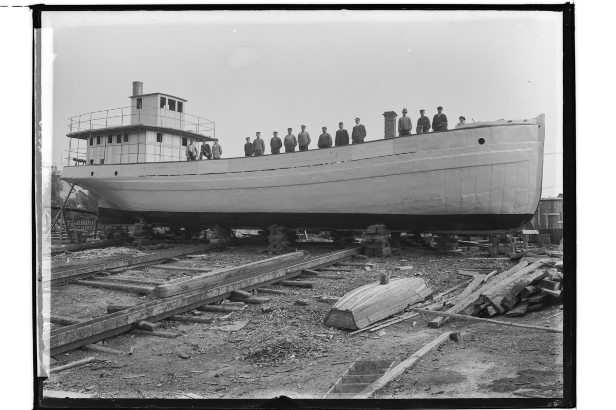 Skebäck, varvet, litet lastfartyg på slipern.15 arbetare på däck.