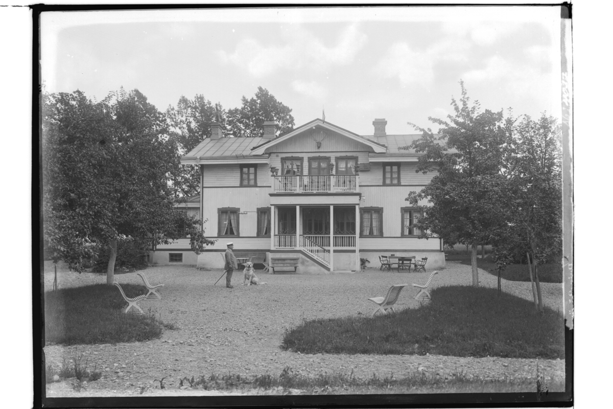 Tvåvånings bostadshus med balkong, veranda och frontespis.