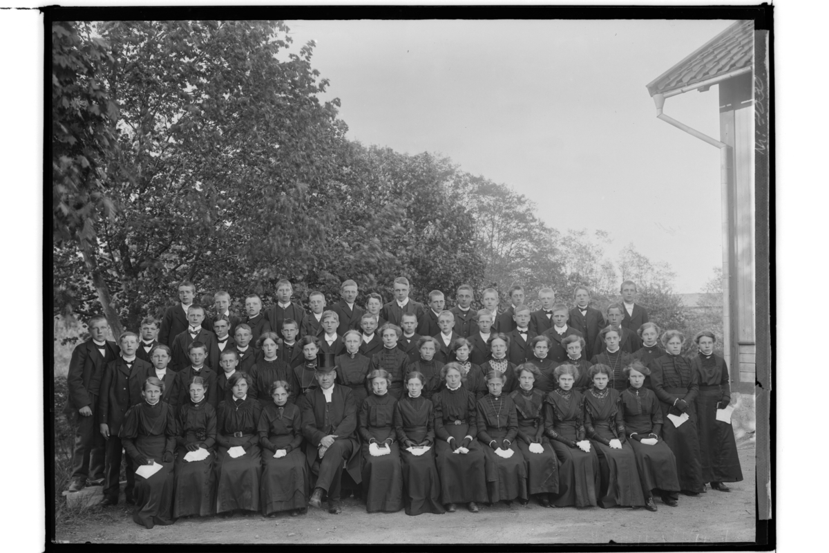 Konfirmander, en präst och läsbarn.
