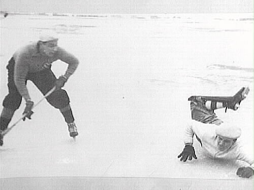 Bandymatch på Eyravallen. Jojje Gustafsson i kamp mot Viljan, målvakt.