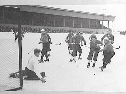 Bandy vid Eyravallen. Skoghallbacken ruffar(=spelar hårt) på Olle Sääv.