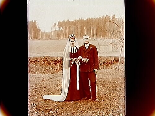 Brudpar, bruden i svart klänning och vit slöja, krona, brudgummen i frack.