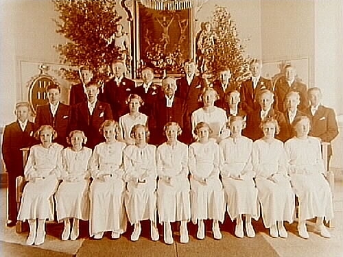 Konfirmander, 11 flickor, 14 pojkar och kyrkoherde Morén.