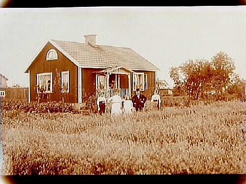 Envånings bostadshus, grupp, 5 personer framför huset.