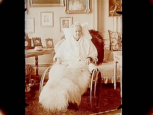 Rumsinteriör, äldre dam i rullstol.