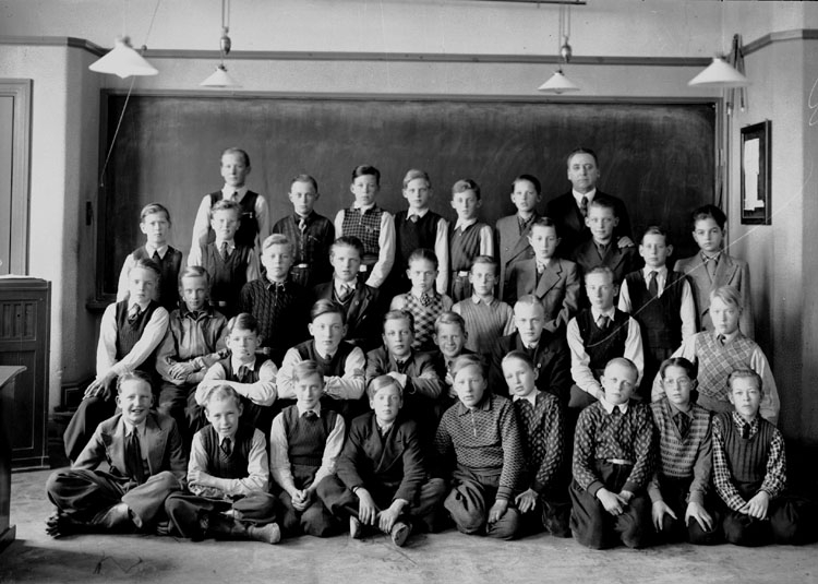 Engelbrektsskolan, klassrumsinteriör, 34 pojkar med lärare C. F. Strömberg.