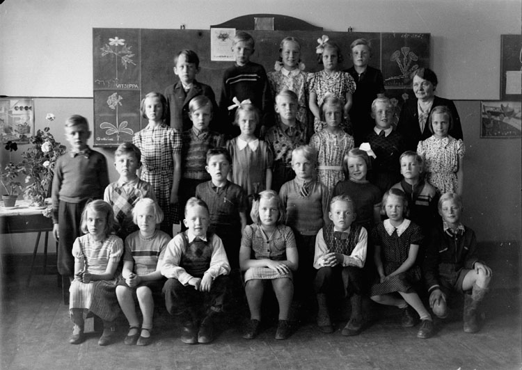 Olaus Petriskolan, klassrumsinteriör, 25 skolbarn med lärarinna fröken Elisabeth Grahn.