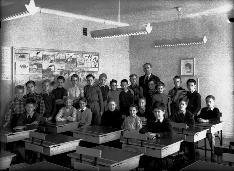 Titel: Rynninge skola, klassrumsinteriör, 23 pojkar med lärare Walter Köhlmark. Klass 4B, sal 7.