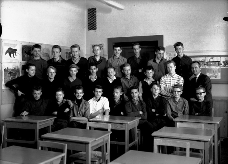Olaus Petriskolan, klassrumsinteriör, 25 pojkar med lärare Nils Boqvist.