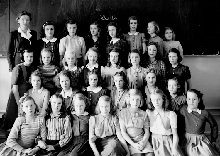 Kommunala flickskolan, klassrumsinteriör, 28 flickor med lärarinna fru Astrid Lundh.