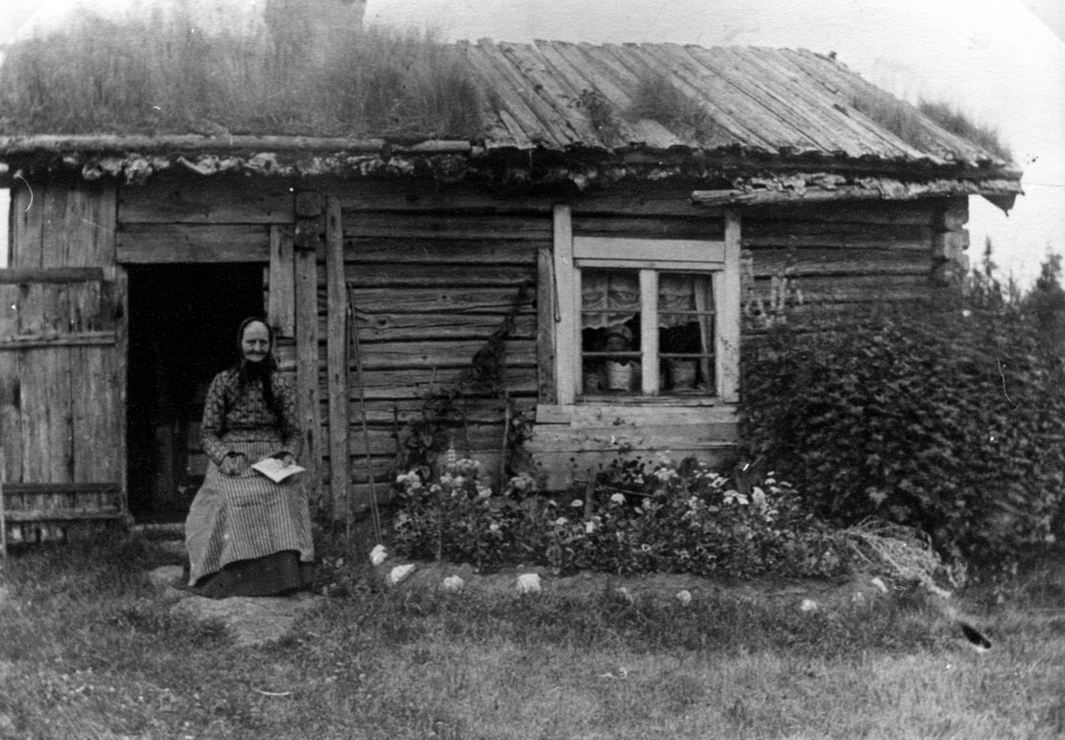 En kvinna framför ett torp. Torpet nedlades 1917.