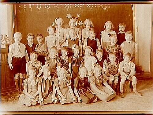 Engelbrektsskolan, klassrumsinteriör, 26 skolbarn med lärarinna fru Svärd, klass 2, sal 6.